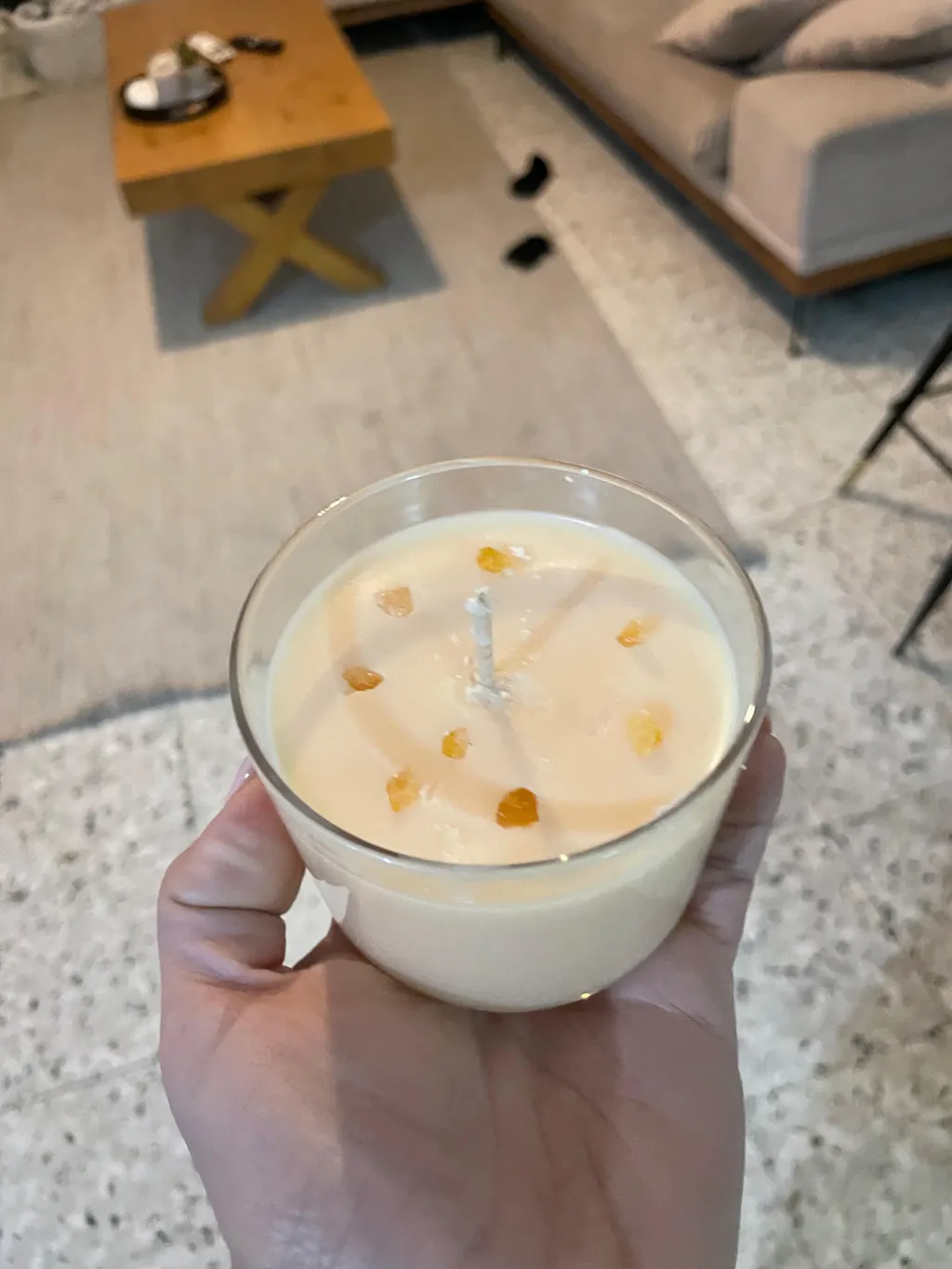 ملاحظة: إذا كنتِ تُجرين العملية مع أطفال أو كنتِ تعانين من ضيق الوقت، يُمكنكِ تسخين الشمع إلى 70 درجة فقط وإضافة العطر عند هذه الدرجة.