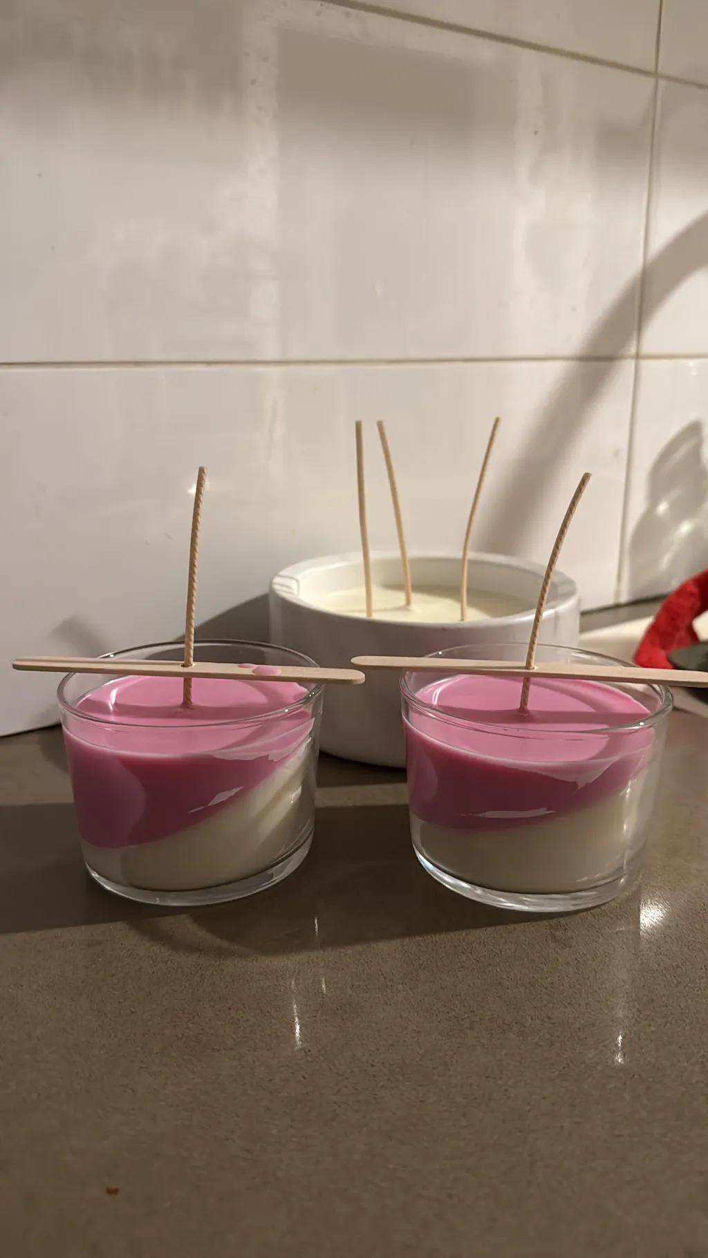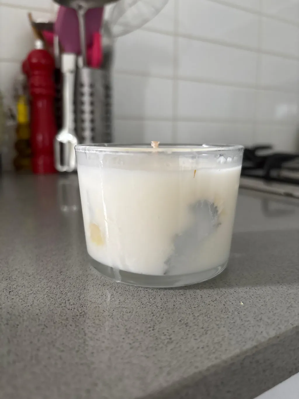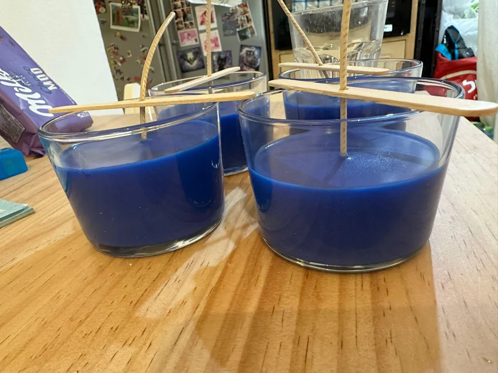 تحضير الشموع في الميكروويف (على دفعتين): سخّن نصف كيلوغرام من الشمع في الميكروويف حتى يصبح سائلاً، ثم أخرجه وحرّكه وتحقق من درجة الحرارة (من المهم التأكد من عدم الإفراط في التسخين وعدم تجاوز 85 درجة مئوية لأن ذلك قد يتلف الشمع).